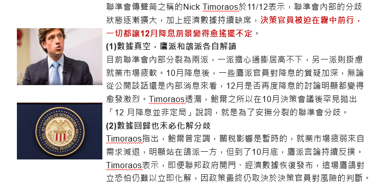 Fed傳聲筒Nick Timoraos於11/12表示,12月降息前景變得愈搖擺不定