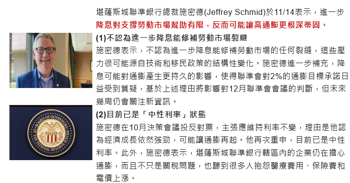 Fed官員施密德於11/14表示,進一步降息對支撐勞動市場幫助有限