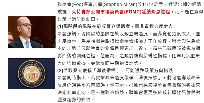 Fed理事米蘭於11/14表示,近期出爐的經濟數據,支持Fed延續降息進程