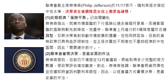 Fed副主席傑佛森於11/17表示,決策者在後續降息步伐上需「更為謹慎」
