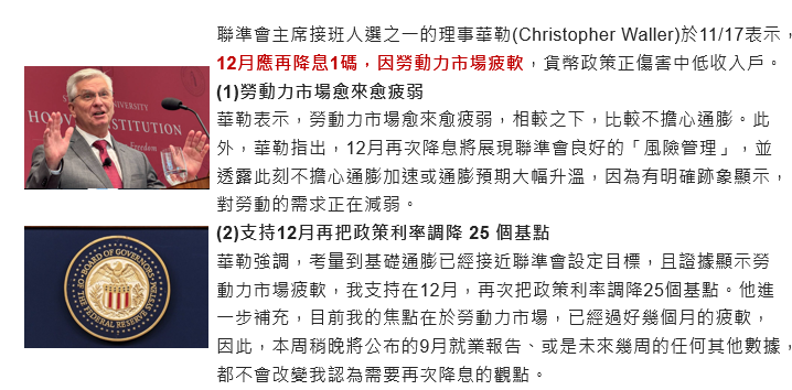Fed理事華勒於11/17表示,12月應再降息1碼,主因勞動力市場持續疲軟