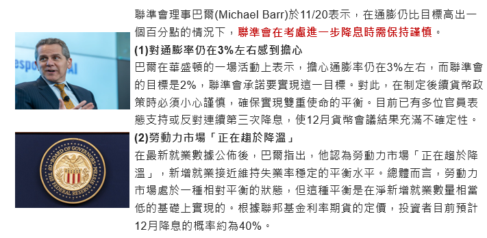 Fed理事巴爾於11/20表示,Fed在考慮進一步降息時仍需保持謹慎