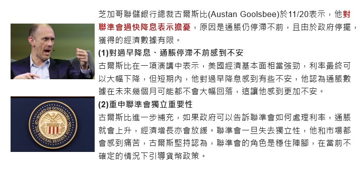 Fed官員古爾斯比於11/20表示,對Fed降息步調過快感到擔憂