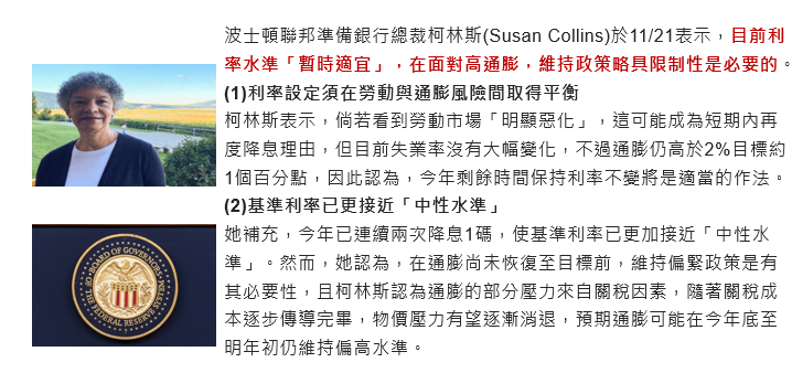 Fed官員柯林斯於11/21表示,面對高通膨狀況,維持利率略具限制性是必要的