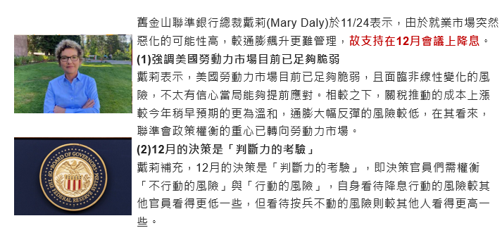 Fed官員戴莉於11/24表示,由於就業市場突然惡化的可能性高,故支持在12月會議上降息